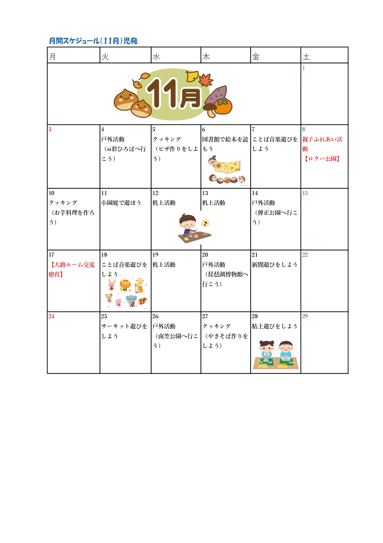 また、公園の木々も少しずつ葉を落とし始めています。落ち葉やドングリ拾いなど、季節の移り変わりを五感で感じながら、戸外活動も楽しんでいければと考えています。