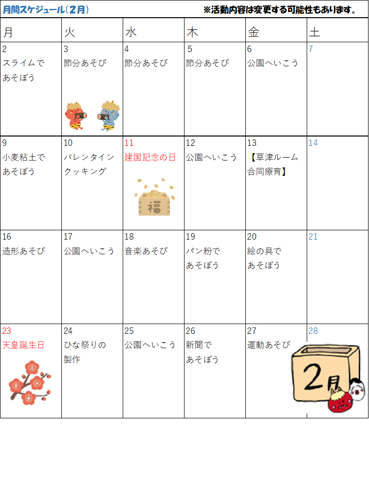 大路ルーム 2月のプログラム 投稿日 2026年2月2日 著者 petit002room カテゴリー お知らせ まだまだ寒さの厳しい季節が続きますね。体調を崩しやすい時期でもありますので、プティットでも手洗い・換気などを行いながら、元気に過ごせるようにしていきます。 2月は節分。豆まきにちなんだあそびや、鬼の帽子作りなど季節の行事も楽しんでいきます。「どきどき」な気持ちも「やってみたい」気持ちも大切にしながら、一人ひとりのペースで参加できるようにしていきます。引き続き、体調管理に気をつけて寒い冬を元気に乗り切りましょう。 プログラム 児童発達支援